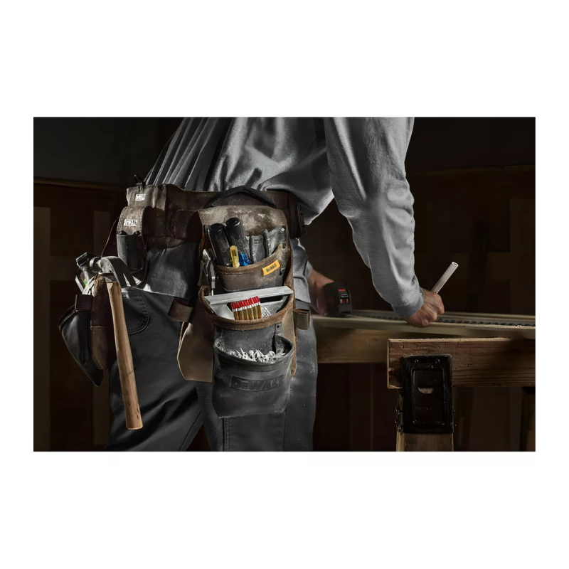 Acceda a sus herramientas, accesorios y más con DEWALT. Diseñada para soportar las duras condiciones del lugar de trabajo, esta solución de almacenamiento de primera línea mantiene los elementos esenciales cotidianos organizados y listos con 18 bolsillos de diferentes tamaños. Ligera y portátil con un asa de transporte resistente, esta bolsa de cuero de primera calidad ofrece mucho espacio para sus necesidades.
